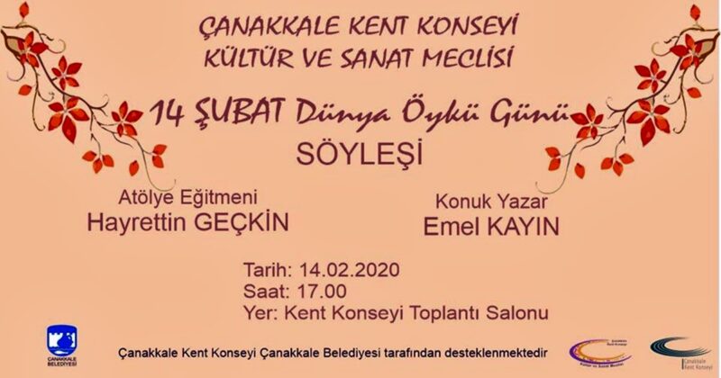 Çanakkale Kent Konseyi Kültür ve Sanat Meclisi, 14 Şubat Dünya Öykü Günü nedeniyle Atölye Eğitmeni Hayrettin Geçkin ve Konuk Yazar Emel Kayın’ın katılımıyla bir söyleşi gerçekleştirecek.