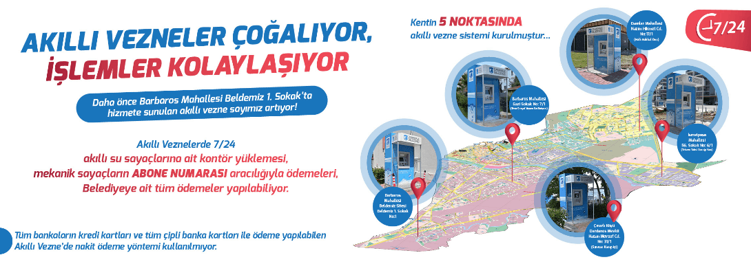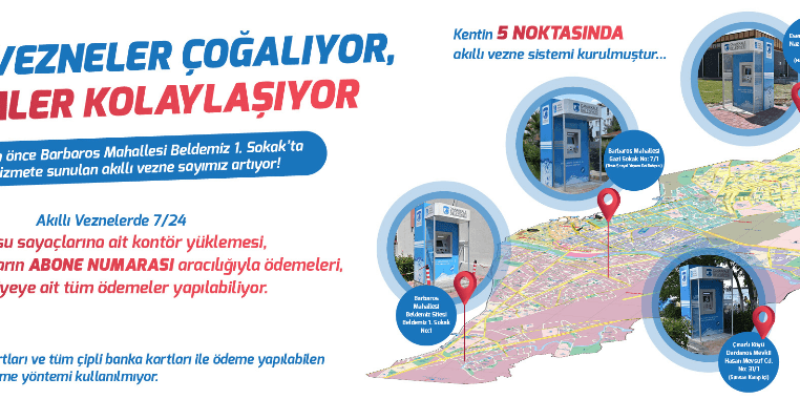 Bu kapsamda Akıllı Veznelerde; akıllı su sayaçlarına ait kontör yüklemesi, mekanik sayaçların Abone Numarası Vasıtası ile ödemeleri, Belediye ait tüm borçlarının ödemeleri ve taksitli ödemeler yapılabilecek.