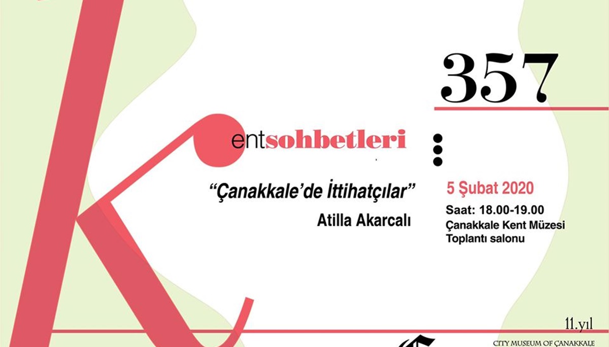 Çanakkale Kent Müzesi’nde Kent Sohbetleri sürüyor. 5 Şubat saat 18.00 ile 19.00 arasında düzenlenecek etkinlikte, Atilla Akarcalı ”Çanakkale’de İttihatçılar” konusunu anlatacak. Sohbetler Çanakkale Kent Müzesi Toplantı Salonu’nda yapılacak.