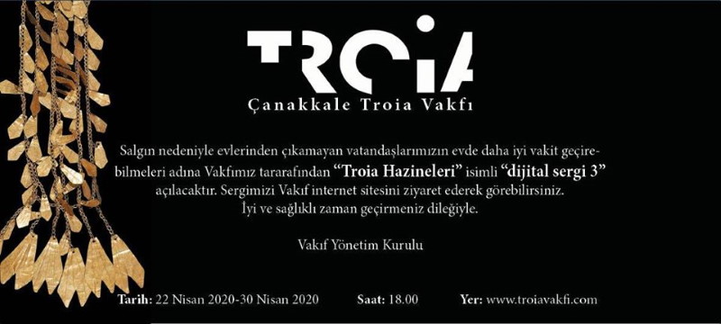“Salgın nedeniyle evlerinden çıkamayan vatandaşlarımızın evde daha iyi vakit geçirebilmeleri adına Vakfımız tarafından “Troia Hazineleri” isimli “dijital sergi 3″ açılacaktır. Sergimizi Vakıf internet sitesini ziyaret ederek görebilirsiniz. İyi ve sağlıklı zaman geçirmeniz dileğiyle.”
